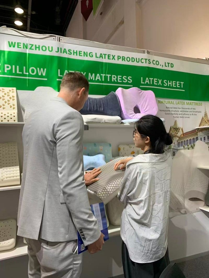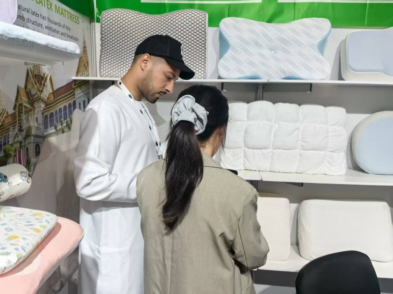ఈ దుబాయ్ స్లీప్ ఎగ్జిబిషన్లో, ప్రపంచవ్యాప్తంగా ఉన్న సందర్శకులకు మా నిద్ర-కేంద్రీకృత దిండ్లను చూపించడం మాకు గౌరవంగా ఉంది. మేము మార్కెట్లో అత్యధికంగా అమ్ముడవుతున్న రెండు దిండులను ప్రదర్శించడానికి అంకితం చేస్తున్నాము: దిసహజ రబ్బరు దిండుమరియు ఆధునిక స్మార్ట్ మెటీరియల్మెమరీ ఫోమ్ దిండు. రబ్బరు పాలు యొక్క శీఘ్ర రీబౌండ్ మరియు యాంటీ-అలెర్జీ లక్షణాలను రబ్బరు పాలు ఔత్సాహికులు ఎక్కువగా ఇష్టపడతారు. ఇంతలో, మెమరీ ఫోమ్ యొక్క అంతిమ అమరిక లోతైన నిద్రను అందిస్తుంది. సైట్లోని కస్టమర్లతో మా లోతైన సంభాషణ మాకు వారి దిండులను వెంబడించేలా చేసింది. విభిన్న నిద్ర అలవాట్ల కోసం వ్యక్తిగతీకరించిన ఎంపికలను అందించడం నాణ్యమైన నిద్రకు కీలకమని మేము గట్టిగా నమ్ముతున్నాము.